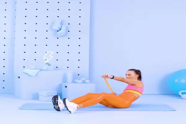 Comment : Allongez-vous face vers le haut avec une bande autour des pieds, les mains derrière la tête et les jambes étendues en