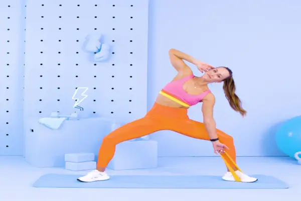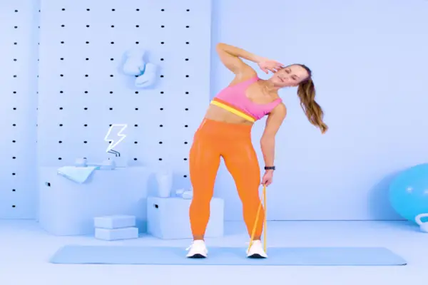 Comment : En position sumo squat, les orteils légèrement tournés, placez une partie de la bande sous le pied gauche et l'autre partie dans la main gauche. Placez la main droite derrière la tête. Gardez les genoux pliés et le tronc engagé lorsque vous vous penchez vers la gauche, puis maintenez la tension sur la bande lorsque vous revenez au centre. C'est un représentant. Faites 30 à 45 secondes d'un côté avant de changer.