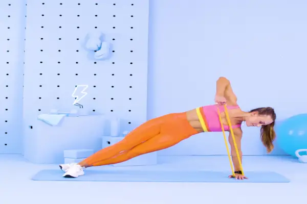 H comment : Commencez par une planche latérale avec une bande sous la main gauche au sol, l'autre extrémité dans la main droite. Restez sur la planche pendant que vous tirez la bande avec la main droite, en commençant par le coude. Retour au début. C'est un représentant. Bougez pendant 30 à 45 secondes de chaque côté.