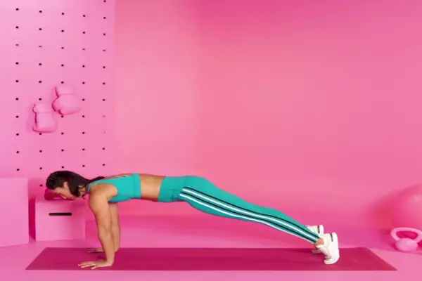 Comment : Commencez en position de planche, les épaules au-dessus des poignets et les pieds écartés à distance des hanches. En maintenant une ligne droite de la tête aux talons, baissez le corps vers le bas et maintenez-le en place à environ 6 pouces au-dessus du tapis. Mettez-vous à genoux pour appuyer sur la planche.