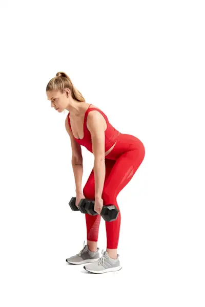 - En gardant votre tronc serré et votre colonne vertébrale neutre, poussez vos fesses vers l'arrière et penchez-vous vers l'avant au niveau des hanches, en pliant légèrement les genoux pendant que vous abaissez les poids vers vos tibias.