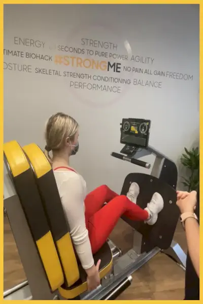 Un entraîneur certifié OsteoStrong a guidé mon échauffement sur leur Vibe Plate, une machine vibrante qui active le système nerveux central. Sur le Plate, ils m'ont guidé à travers des étirements et exercices d'équilibre . Ensuite, ils m'ont accompagné à travers le circuit à quatre machines.
