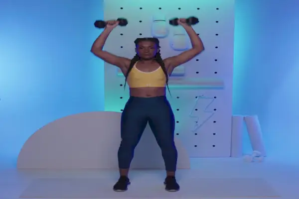 - Maintenez une position neutre avec le dos et le cou, engagez le tronc, enfoncez les talons dans le sol et revenez à la position de départ debout, en gardant les haltères près du corps lorsque vous vous déplacez dans les deux sens. Cela fait 1 répétition.