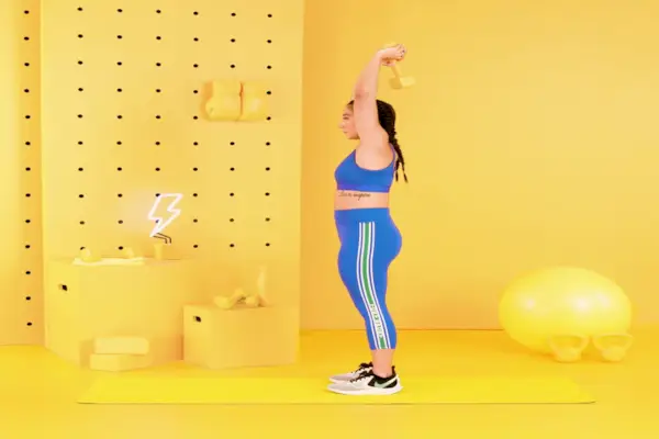 - En gardant le haut des bras près des oreilles, pliez les coudes pour abaisser lentement le poids derrière votre tête et faites une pause.