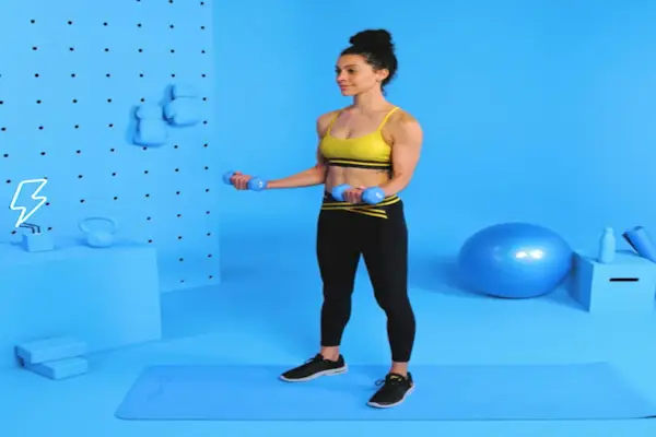- Tenez-vous debout avec un haltère dans chaque main, les bras sur le côté, les paumes tournées vers le bas et vers l’intérieur.