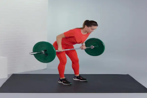 - Pliez légèrement les genoux et penchez-vous à partir des hanches jusqu'à ce que vos mains soient devant vos genoux. Gardez les abdominaux engagés. Rapprochez les omoplates en tirant la barre vers vous jusqu'à ce qu'elle touche votre torse juste au-dessus du nombril. (Ne haussez pas les épaules jusqu’aux oreilles !).
