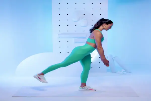 - Déplacez le poids sur une jambe et maintenez-la légèrement pliée tout en vous penchant vers l'avant au niveau des hanches, en étendant l'autre jambe directement derrière vous, jusqu'à ce que votre torse soit parallèle au sol.